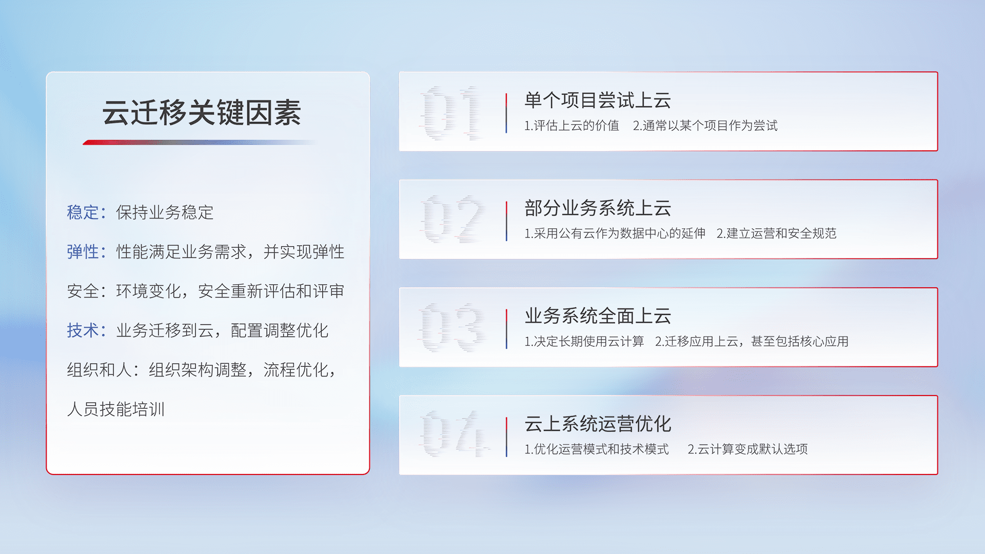 结合实际业务,,,,从规划设计、、、云平台选型、、、、云原生改造、、数据迁移、、集成交付,,,,迁移全过程为客户识别最佳上云路径,,,,做好风险识别管理,,,设计网络架构、、身份权限、、安全审计合规、、、操作审计、、日志审计、、、监控告警策略、、、多站点容灾设计等,,,对云上基础设施进行整体规划,,提升IT治理水平,,以满足弹性、、高可用、、高性能的需求。。。。