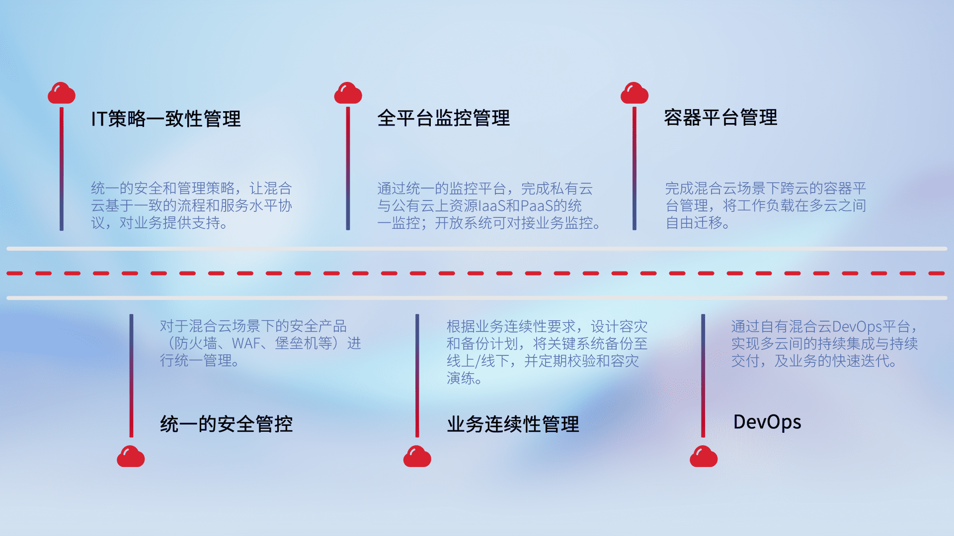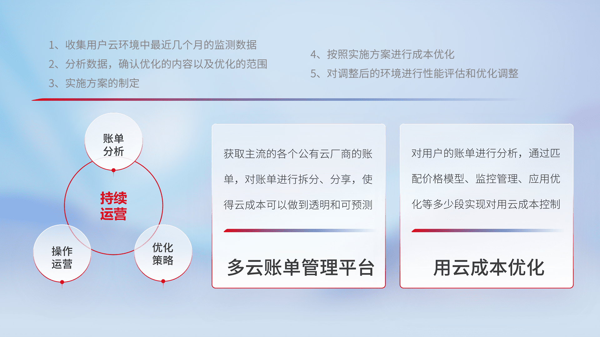通过多云纳管,,以统一的资源数据模型把客户的云资源进行抽象和封装,,,进而实现对多云资源的统一操作,,,,保障云资源管理的可靠性、、稳定性与可用性。。。量身定制化运维内容,,配置、、开发运维、、、、补丁管理、、、、备份、、监控、、、认证和访问管理、、、审计和日常巡检等,,保障在用云过程中的可靠度,,稳定度以及高可用率。。。