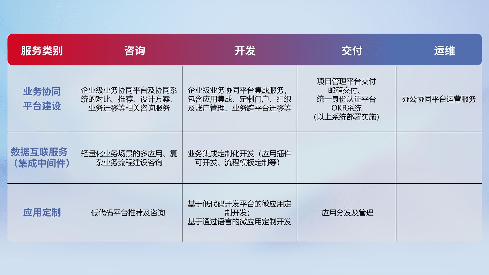 针对钉钉、、、企微、、IDaas等平台级产品提供产品的规划、、方案、、、、交付、、定制化开发等服务,,,实现如统一协同办公、、、智能客户服务、、、混合会议管理、、智能数据查询、、等业务场景,,实现数字化转型。。。